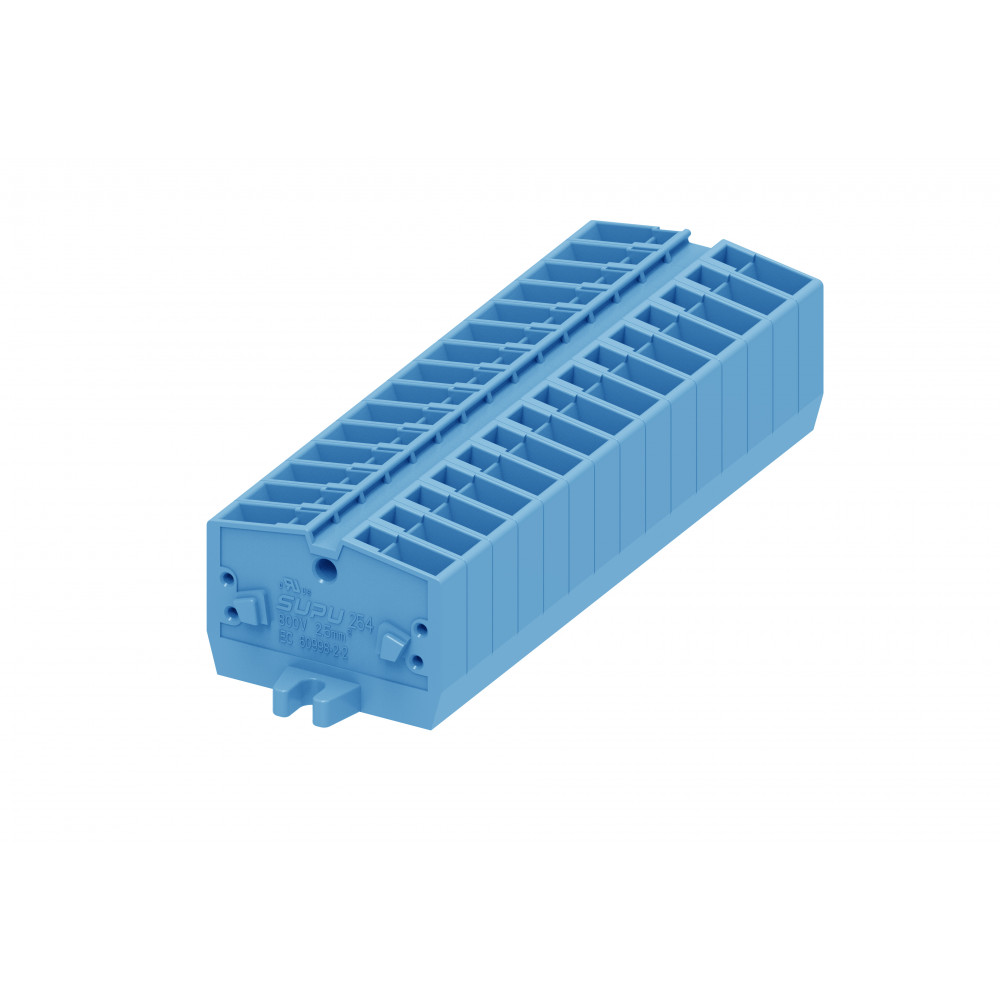 Мини клемма, верхний подвод кабеля, 2 точки подключения в клемме, тип фиксации провода: пружинный, номинальное сечение: 2,5 мм кв., 24A, 800V, цвет: синий, тип монтажа: монтажные фланцы