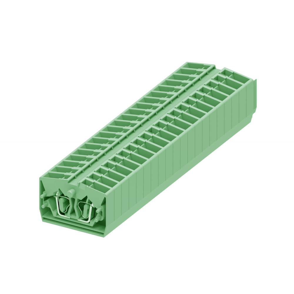 Мини клемма, верхний подвод кабеля, 2 точки подключения в клемме, тип фиксации провода: пружинный, номинальное сечение: 2,5 мм кв., 24A, 800V, цвет: зеленый, тип монтажа: без фиксации