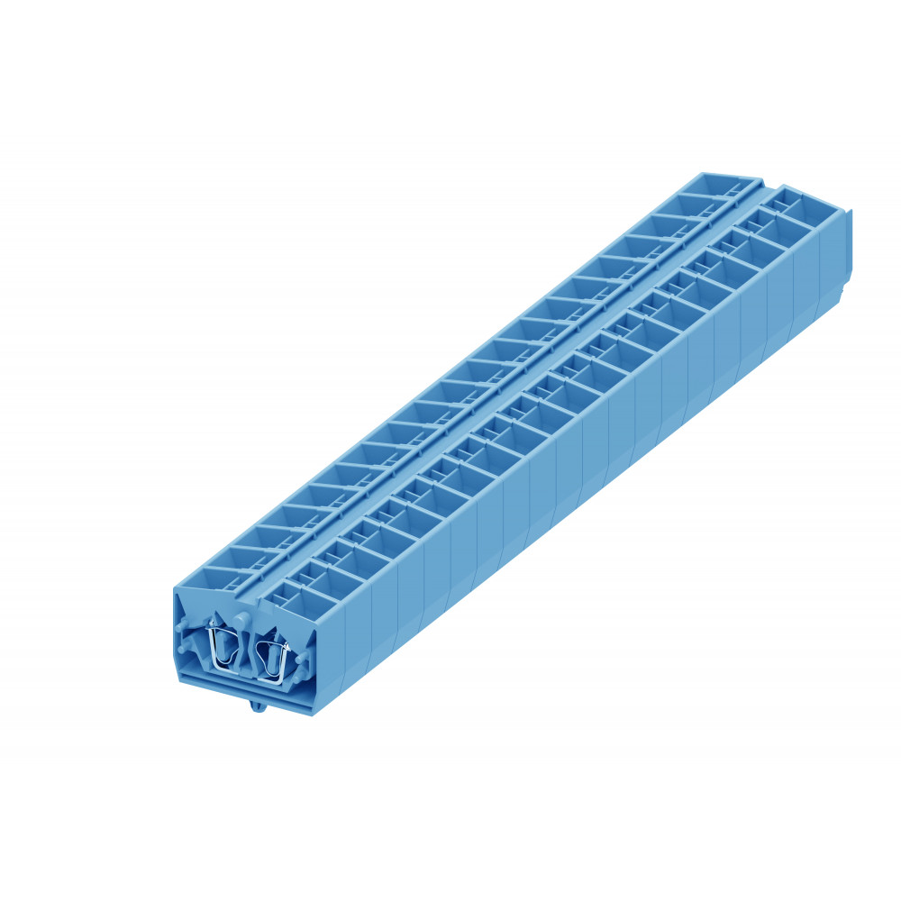 Мини клемма, верхний подвод кабеля, 4 точки подключения в клемме, тип фиксации провода: пружинный, номинальное сечение: 2,5 мм кв., 24A, 800V, цвет: синий, тип монтажа: защелки в панель