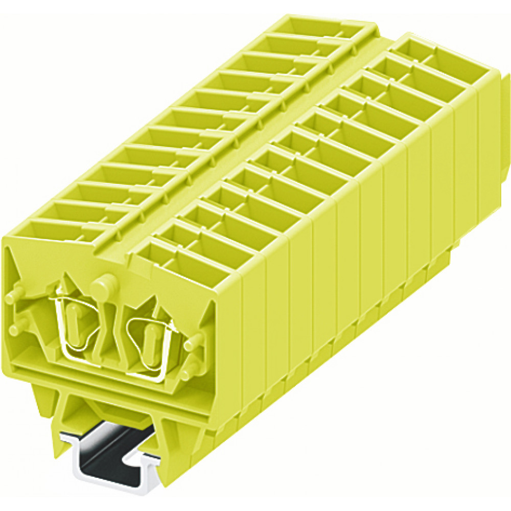 Мини клемма, верхний подвод кабеля, 2 точки подключения в клемме, тип фиксации провода: пружинный, номинальное сечение: 2,5 мм кв., 24A, 800V, цвет: желтый, тип монтажа: DIN15