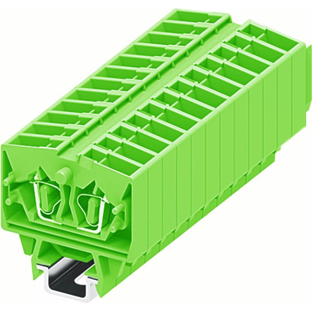 Мини клемма, верхний подвод кабеля, 2 точки подключения в клемме, тип фиксации провода: пружинный, номинальное сечение: 2,5 мм кв., 24A, 800V, цвет: зеленый, тип монтажа: DIN15