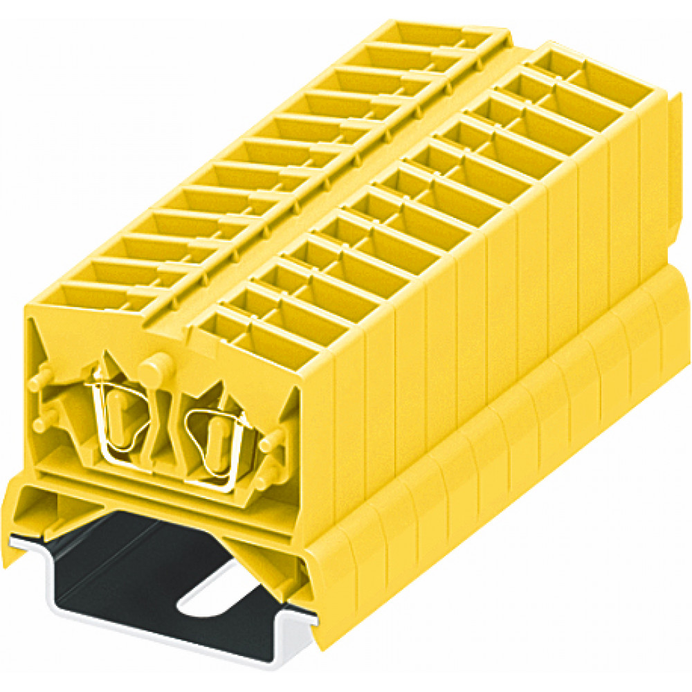 Мини клемма, верхний подвод кабеля, 2 точки подключения в клемме, тип фиксации провода: пружинный, номинальное сечение: 2,5 мм кв., 24A, 800V, цвет: желтый, тип монтажа: DIN35