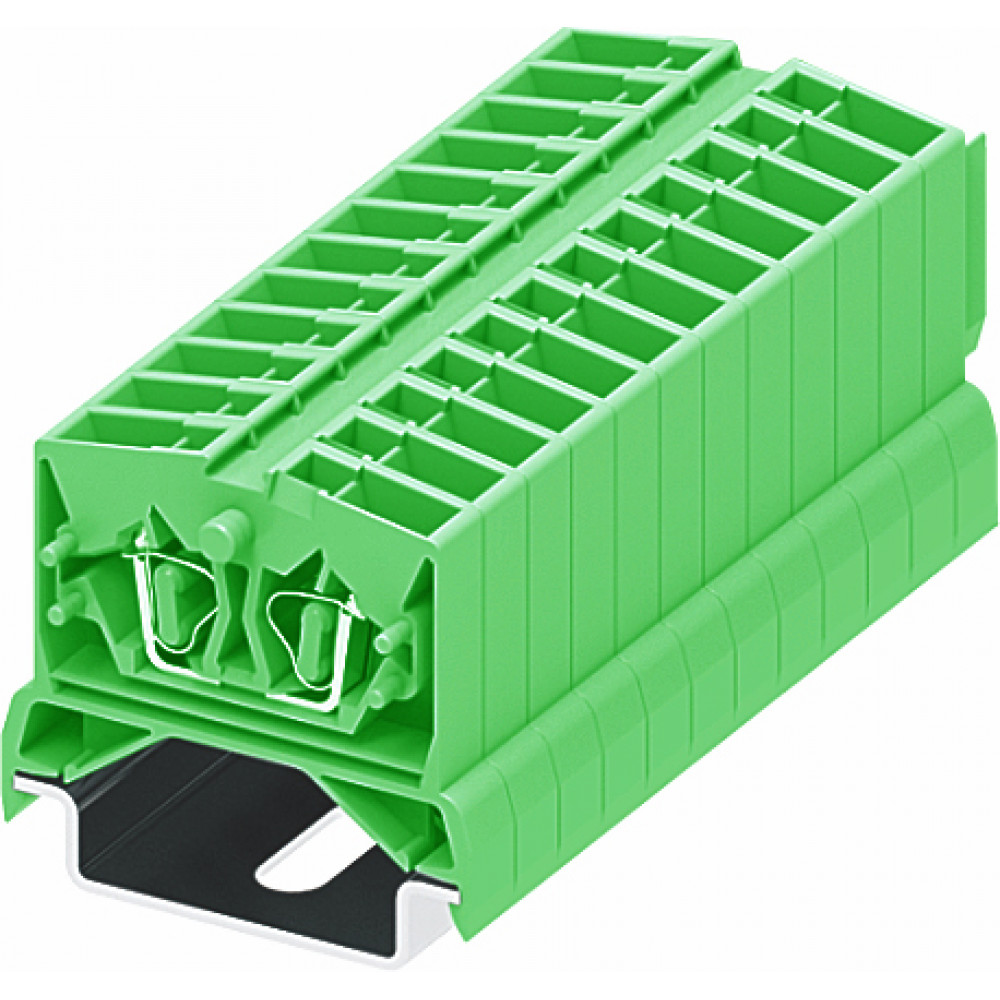Мини клемма, верхний подвод кабеля, 2 точки подключения в клемме, тип фиксации провода: пружинный, номинальное сечение: 2,5 мм кв., 24A, 800V, цвет: зеленый, тип монтажа: DIN35