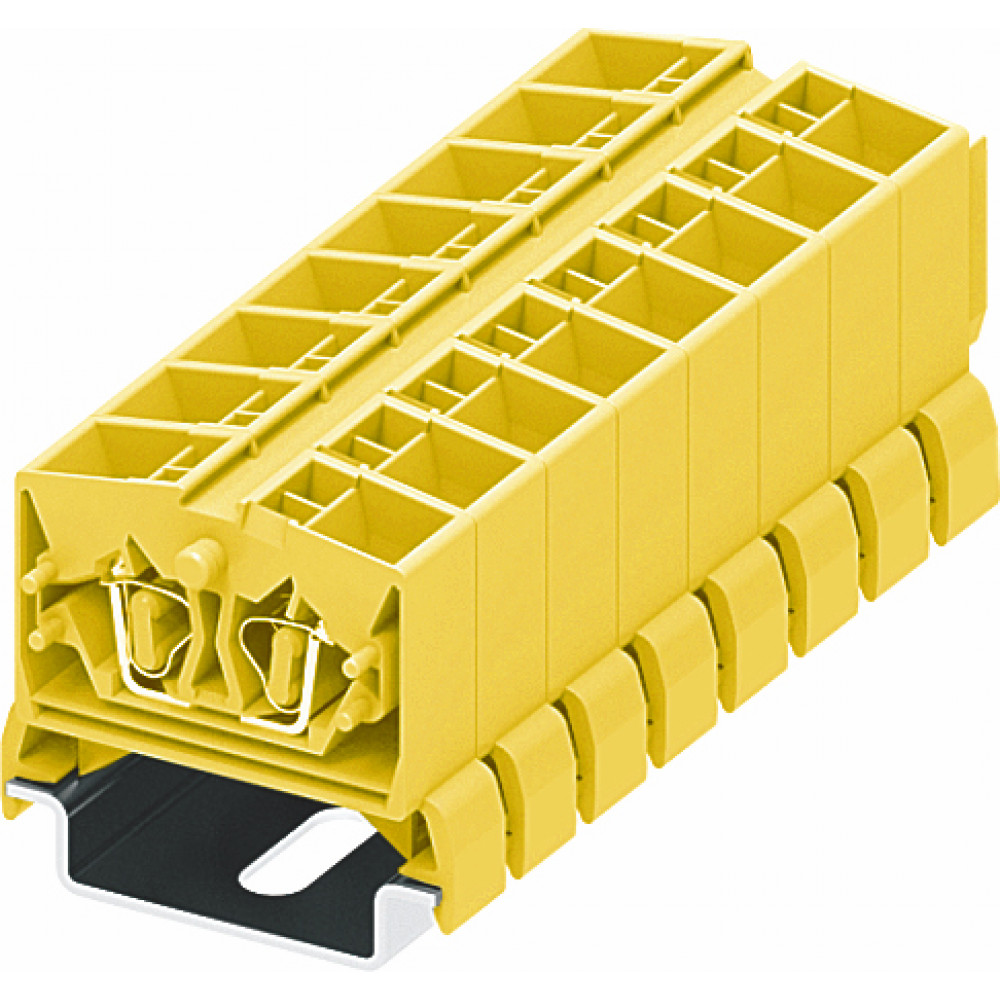 Мини клемма, верхний подвод кабеля, 4 точки подключения в клемме, тип фиксации провода: пружинный, номинальное сечение: 2,5 мм кв., 24A, 800V, цвет: желтый, тип монтажа: DIN35