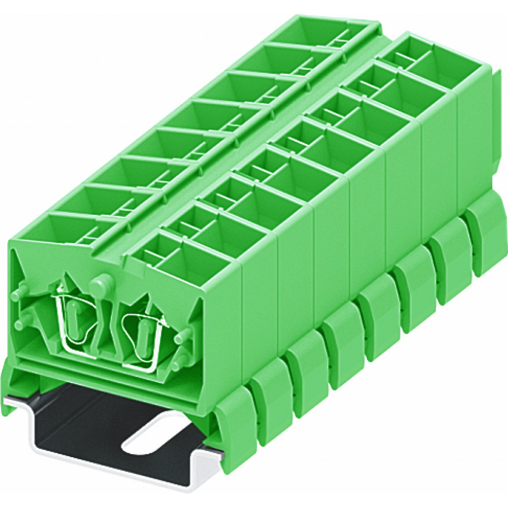 Мини клемма, верхний подвод кабеля, 4 точки подключения в клемме, тип фиксации провода: пружинный, номинальное сечение: 2,5 мм кв., 24A, 800V, цвет: зеленый, тип монтажа: DIN35