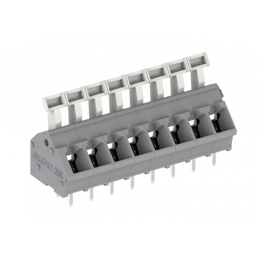 Клемма, подвод кабеля 45 град., на плату, шаг: 5.0 мм, 8 полюсов, фиксация провода push-in, исполнение: два вывода на контакт, рычажный зажим, 320V, 24A, цвет: серый