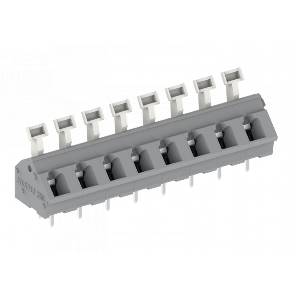 Клемма, подвод кабеля 45 град., на плату, шаг: 7.5 мм, 2 полюса, фиксация провода push-in, исполнение: два вывода на контакт, рычажный зажим, 320V, 24A, цвет: серый