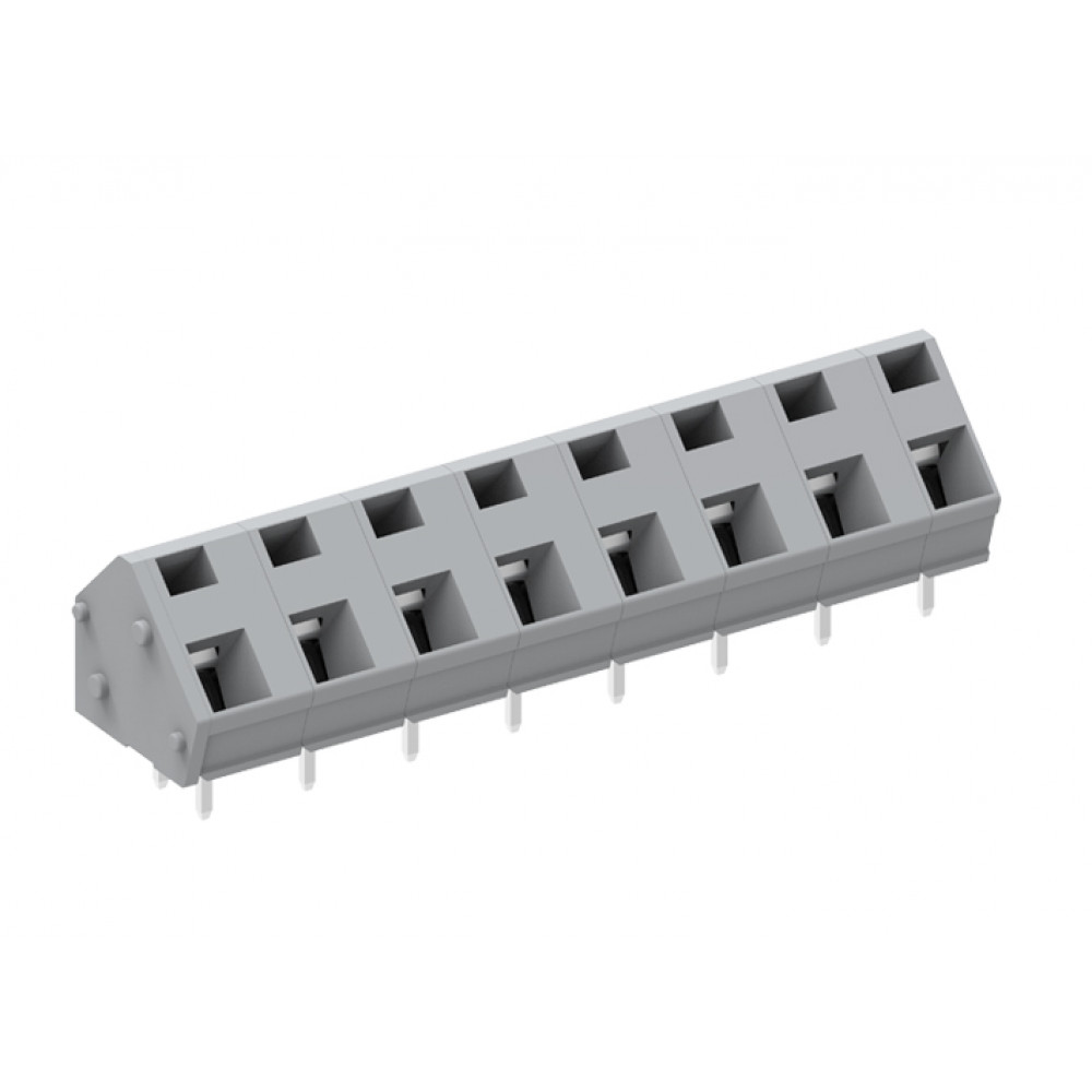 Клемма, подвод кабеля 45 град., на плату, шаг: 7.5 мм, 4 полюса, фиксация провода пружинная, исполнение: два вывода на контакт, 320V, 24A, цвет: серый