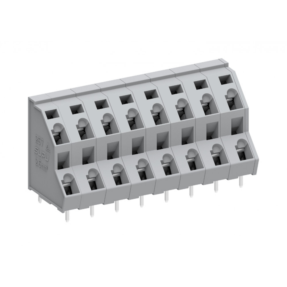 Клемма, 2 этажа, подвод кабеля 45 град., на плату, шаг: 7.5 мм, 16 полюсов, фиксация провода пружинная, исполнение: стандартное, 630V, 21A, цвет: серый