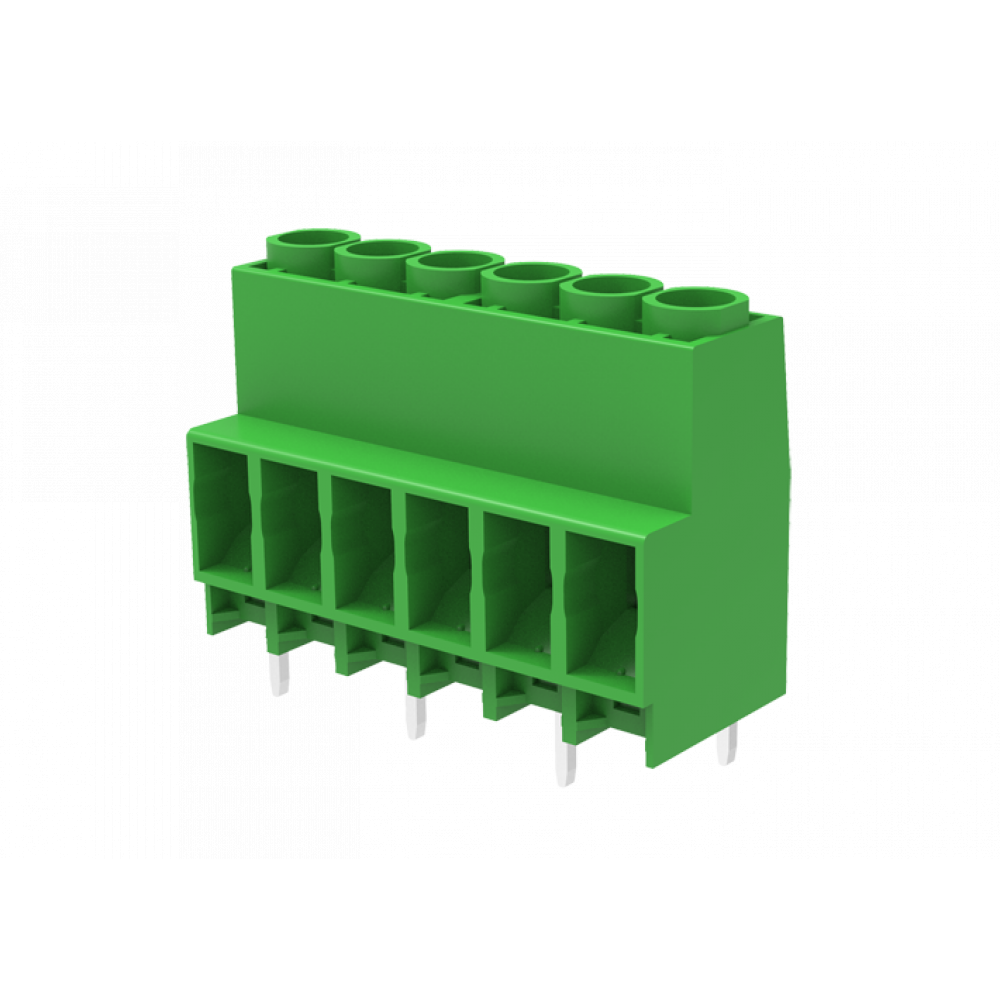 Клемма, горизонтальный подвод кабеля, на плату, шаг: 6.35 мм, 2 полюса, фиксация провода винтовая, исполнение: выводы на плату в шахматном порядке, 1000V, 41A, цвет: зеленый