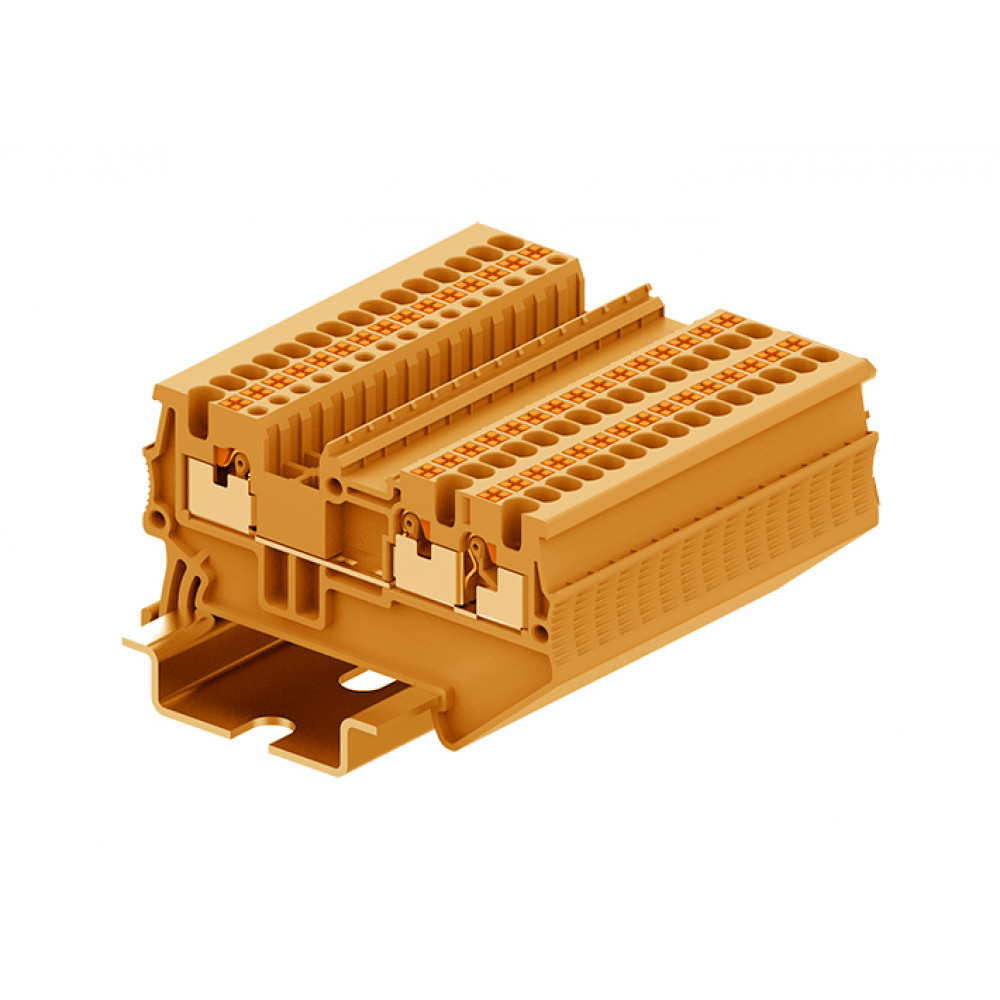 Проходная клемма, 3 точки подключения, тип фиксации провода: push-in, номинальное сечение: 1,5 мм кв., 17,5A, 500V, ширина: 3,5 мм, цвет: оранжевый, тип монтажа: DIN 35