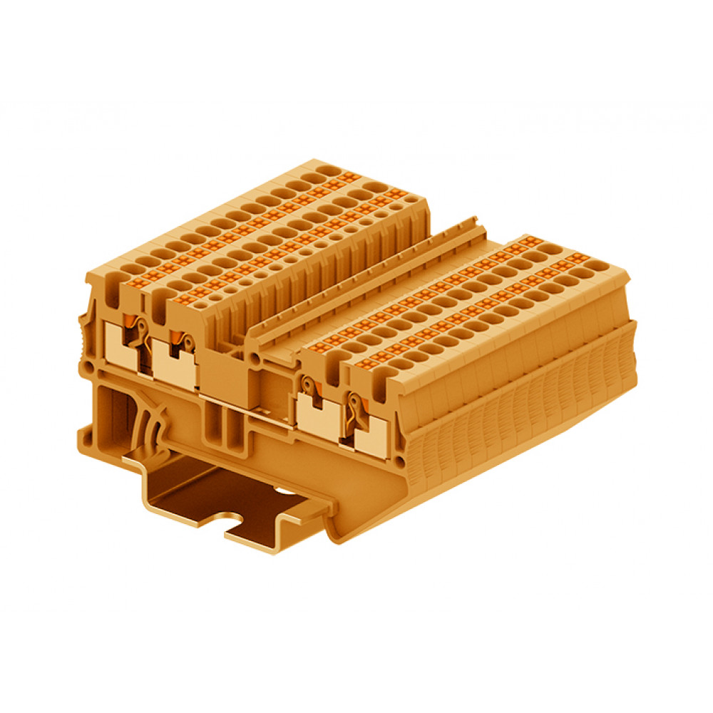 Проходная клемма, 4 точки подключения, тип фиксации провода: push-in, номинальное сечение: 1,5 мм кв., 17,5A, 500V, ширина: 3,5 мм, цвет: оранжевый, тип монтажа: DIN 35