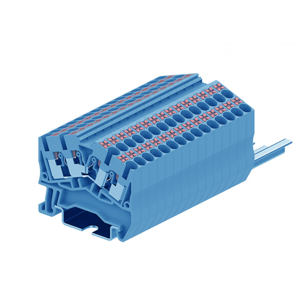 Проходная клемма, угловая, 4 точки подключения, тип фиксации провода: push-in, номинальное сечение: 2,5 мм кв., 24A, 800V, ширина: 5,2 мм, цвет: синий, тип монтажа: DIN 35