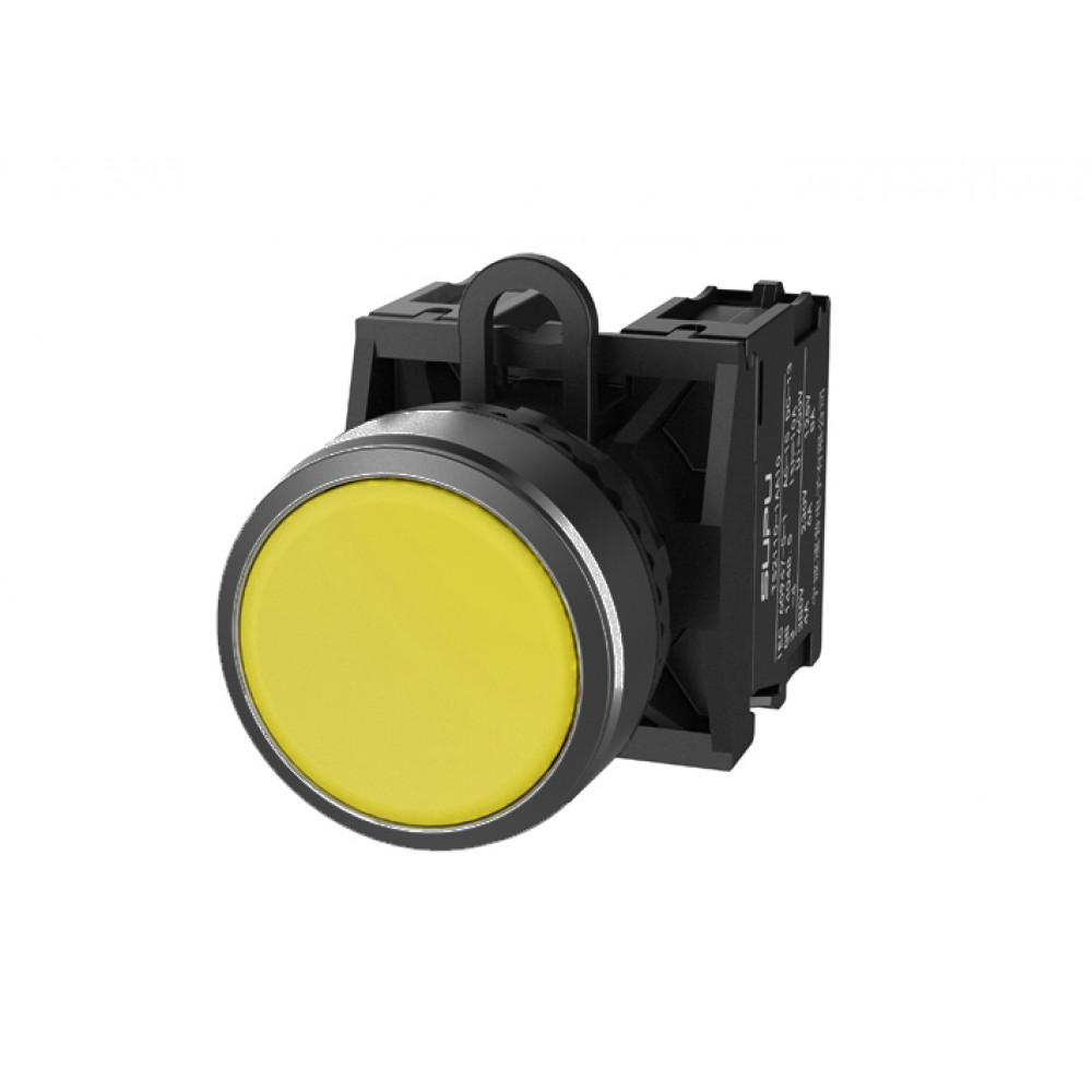 Кнопка круглая плоская, без блокировки, без подсветки, пластиковое переднее кольцо, без контактной группы, диаметр головки кнопки 29,5 мм, диаметр посадочного отверстия: 22 мм, цвет: желтый