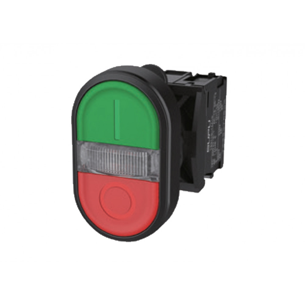 Двухпозиционный кнопочный переключатель плоский верх/выпуклый низ, без подсветки, пластиковое переднее кольцо, без контактной группы, размер головки кнопки 29,5 мм * 49,4 мм, диаметр посадочного отверстия: 22 мм, цвет: зелёный/красный