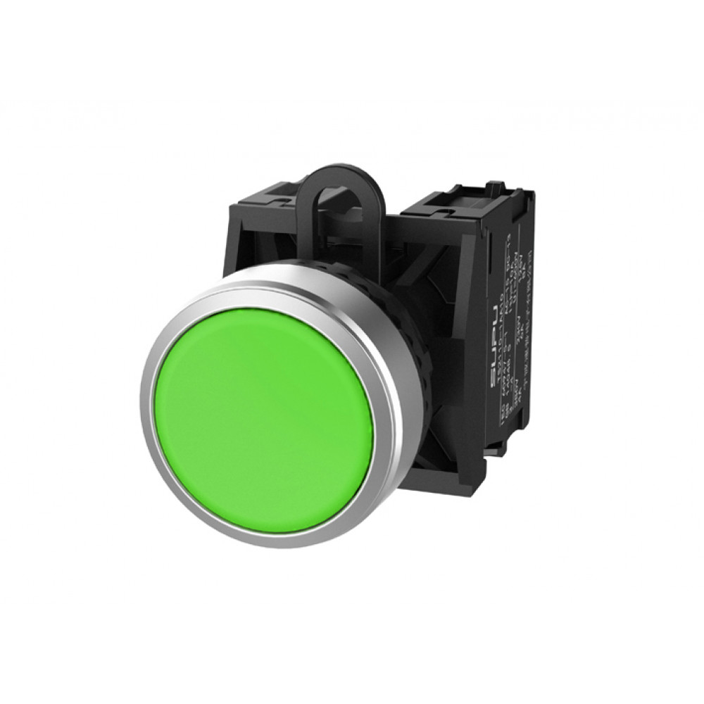Кнопка круглая плоская, без блокировки, без подсветки, алюминиевое переднее кольцо, без контактной группы, диаметр головки кнопки 29,5 мм, диаметр посадочного отверстия: 22 мм, цвет: зеленый