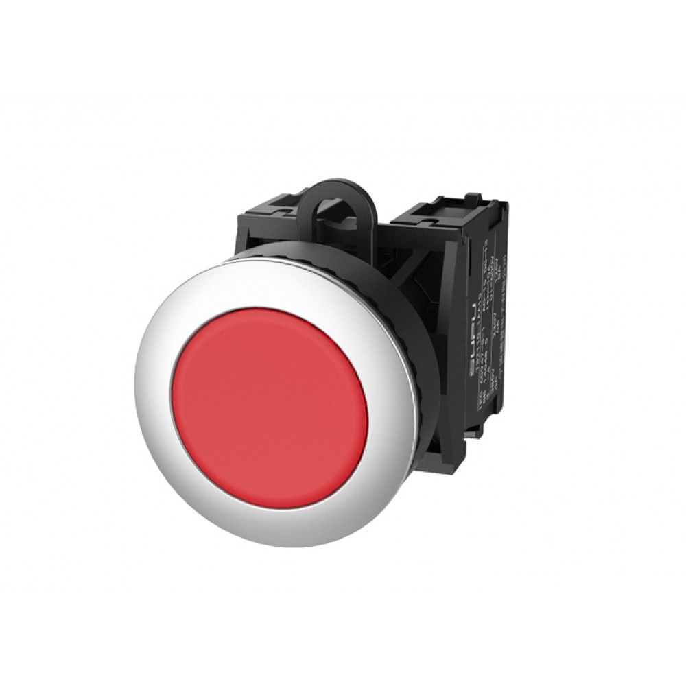 Кнопка круглая плоская, с блокировкой, без подсветки, утопленное алюминиевое переднее кольцо, без контактной группы, диаметр головки кнопки 36 мм, диаметр посадочного отверстия: 22 мм, цвет: красный