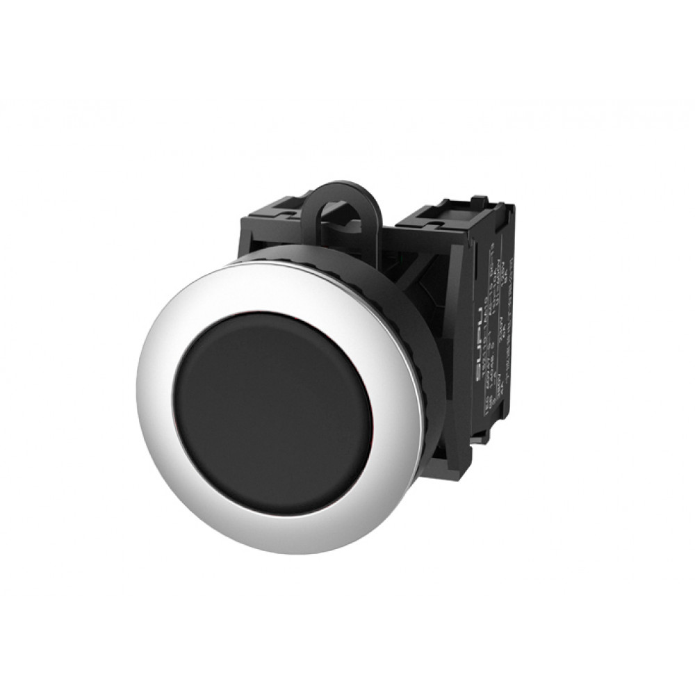 Кнопка круглая плоская, с блокировкой, без подсветки, утопленное алюминиевое переднее кольцо, без контактной группы, диаметр головки кнопки 36 мм, диаметр посадочного отверстия: 22 мм, цвет: черный