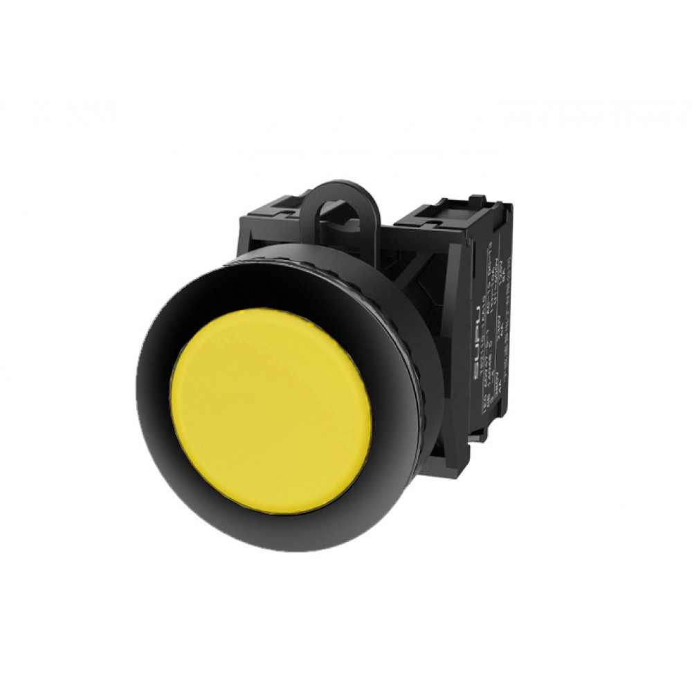 Кнопка круглая плоская, без блокировки, без подсветки, утопленное пластиковое переднее кольцо, без контактной группы, диаметр головки кнопки 36 мм, диаметр посадочного отверстия: 22 мм, цвет: желтый