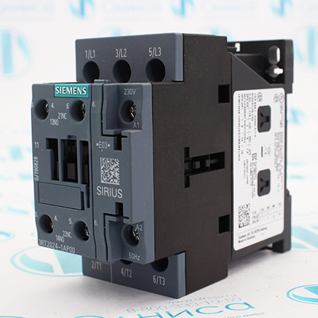 3RT2024-1AP00 Контактор Siemens, 3 пол., ac-3, 5.5квт/400в, блок-контакты 1но+1нз, ном. напряжение управления 230в ас 50гц, типоразмер s0, винтовые клеммы.