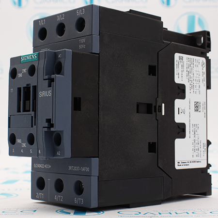 3RT2037-1AF00 Контактор Siemens, 3-пол., 30КВТ/АС3/400В, блок-контакты 1НО+1НЗ, номинальное питающее напряжение цепи управления  US 110В АС 50ГЦ, типоразмер S2, винтовые клеммы.
